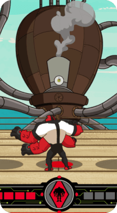 Step into the shoes of Four Arms, one of Ben’s most formidable alien forms, in “No Arm Done.” The city is under siege by the menacing Clocktopus, a mechanical menace with multiple tentacles wreaking havoc along the shoreline. Your mission is to protect the city by dodging Clocktopus’s powerful tentacle strikes and seizing opportunities to counterattack. The battlefield is divided into five zones, with impending attacks indicated by red markers. Quick reflexes are essential to avoid damage.